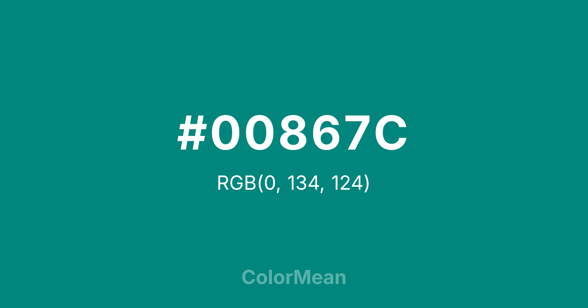 #00867C RGB value is (0, 134, 124). The hex color red value is 0, green is 134, and blue is 124. Its HSL format shows a hue of 176°, saturation of 100 percent, and lightness of 26 percent. The CMYK process values are 100 percent, 0 percent, 7 percent, 47 percent.