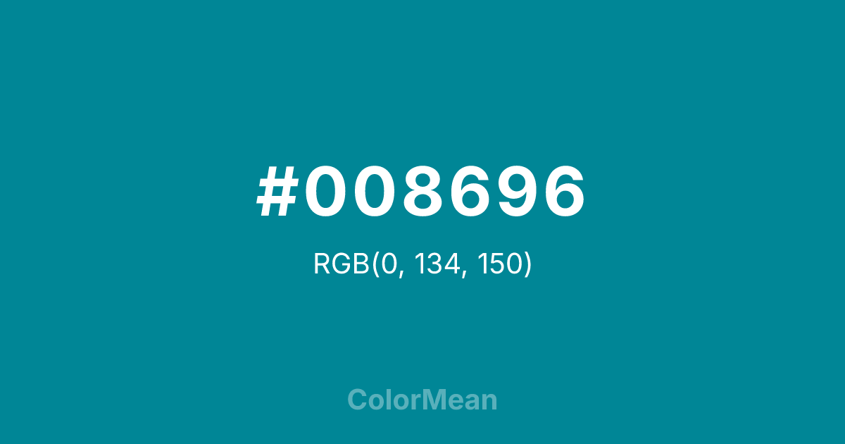 #008696 RGB value is (0, 134, 150). The hex color red value is 0, green is 134, and blue is 150. Its HSL format shows a hue of 186°, saturation of 100 percent, and lightness of 29 percent. The CMYK process values are 100 percent, 11 percent, 0 percent, 41 percent.