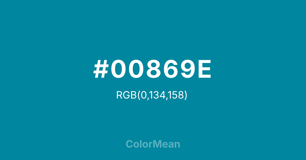 #00869E RGB value is (0, 134, 158). The hex color red value is 0, green is 134, and blue is 158. Its HSL format shows a hue of 189°, saturation of 100 percent, and lightness of 31 percent. The CMYK process values are 100 percent, 15 percent, 0 percent, 38 percent.