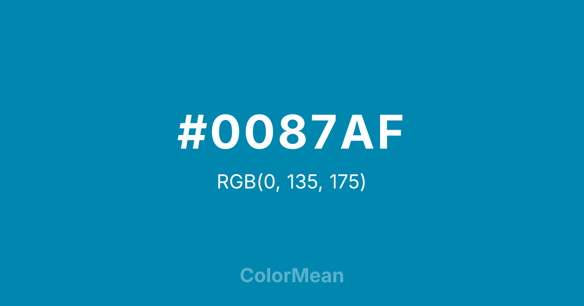 #0087AF RGB value is (0, 135, 175). The hex color red value is 0, green is 135, and blue is 175. Its HSL format shows a hue of 194°, saturation of 100 percent, and lightness of 34 percent. The CMYK process values are 100 percent, 23 percent, 0 percent, 31 percent.