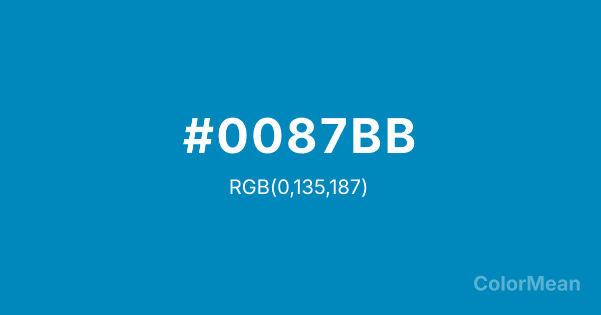 #0087BB RGB value is (0, 135, 187). The hex color red value is 0, green is 135, and blue is 187. Its HSL format shows a hue of 197°, saturation of 100 percent, and lightness of 37 percent. The CMYK process values are 100 percent, 28 percent, 0 percent, 27 percent.