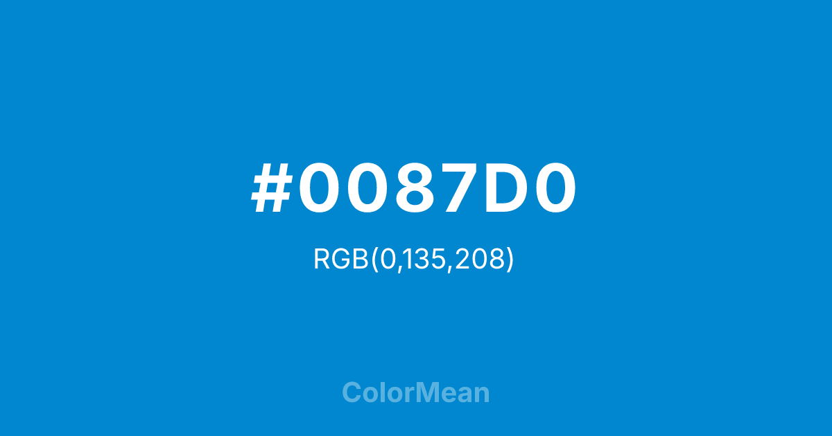 #0087D0 RGB value is (0, 135, 208). The hex color red value is 0, green is 135, and blue is 208. Its HSL format shows a hue of 201°, saturation of 100 percent, and lightness of 41 percent. The CMYK process values are 100 percent, 35 percent, 0 percent, 18 percent.