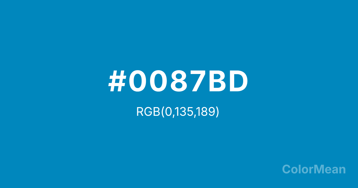 Blue (NCS) (#0087BD) RGB value is (0, 135, 189). The hex color red value is 0, green is 135, and blue is 189. Its HSL format shows a hue of 197°, saturation of 100 percent, and lightness of 37 percent. The CMYK process values are 100 percent, 29 percent, 0 percent, 26 percent.