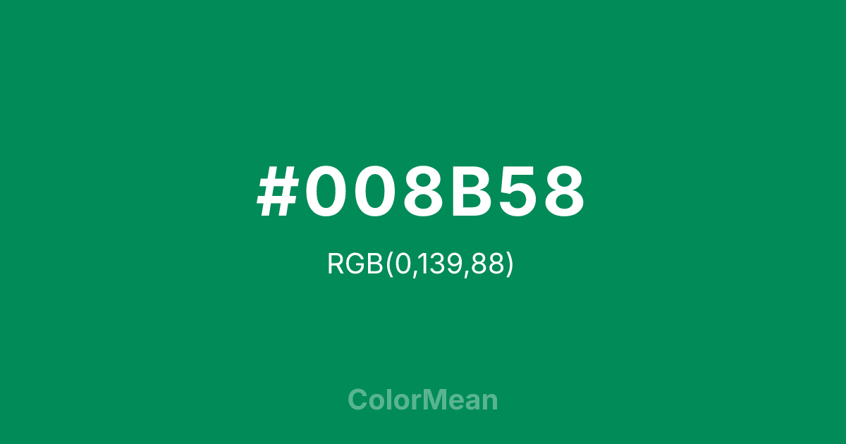 #008B58 RGB value is (0, 139, 88). The hex color red value is 0, green is 139, and blue is 88. Its HSL format shows a hue of 158°, saturation of 100 percent, and lightness of 27 percent. The CMYK process values are 100 percent, 0 percent, 37 percent, 45 percent.