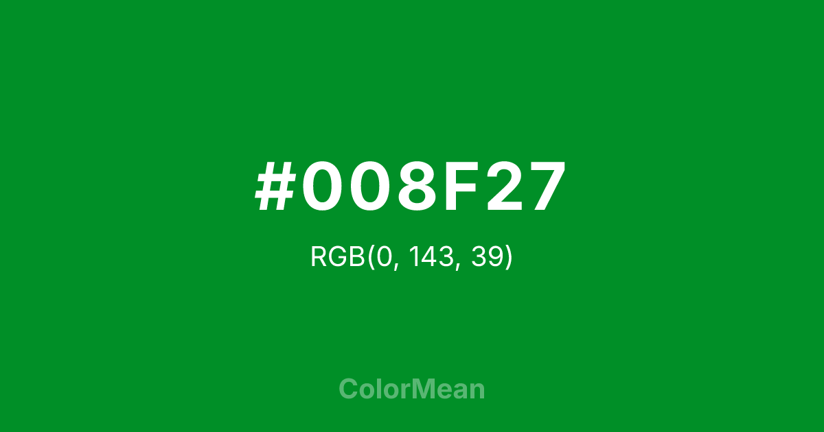 #008F27 RGB value is (0, 143, 39). The hex color red value is 0, green is 143, and blue is 39. Its HSL format shows a hue of 136°, saturation of 100 percent, and lightness of 28 percent. The CMYK process values are 100 percent, 0 percent, 73 percent, 44 percent.