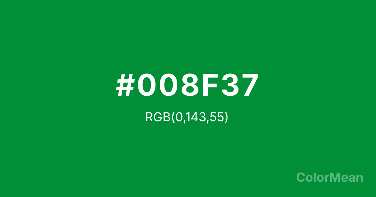#008F37 RGB value is (0, 143, 55). The hex color red value is 0, green is 143, and blue is 55. Its HSL format shows a hue of 143°, saturation of 100 percent, and lightness of 28 percent. The CMYK process values are 100 percent, 0 percent, 62 percent, 44 percent.