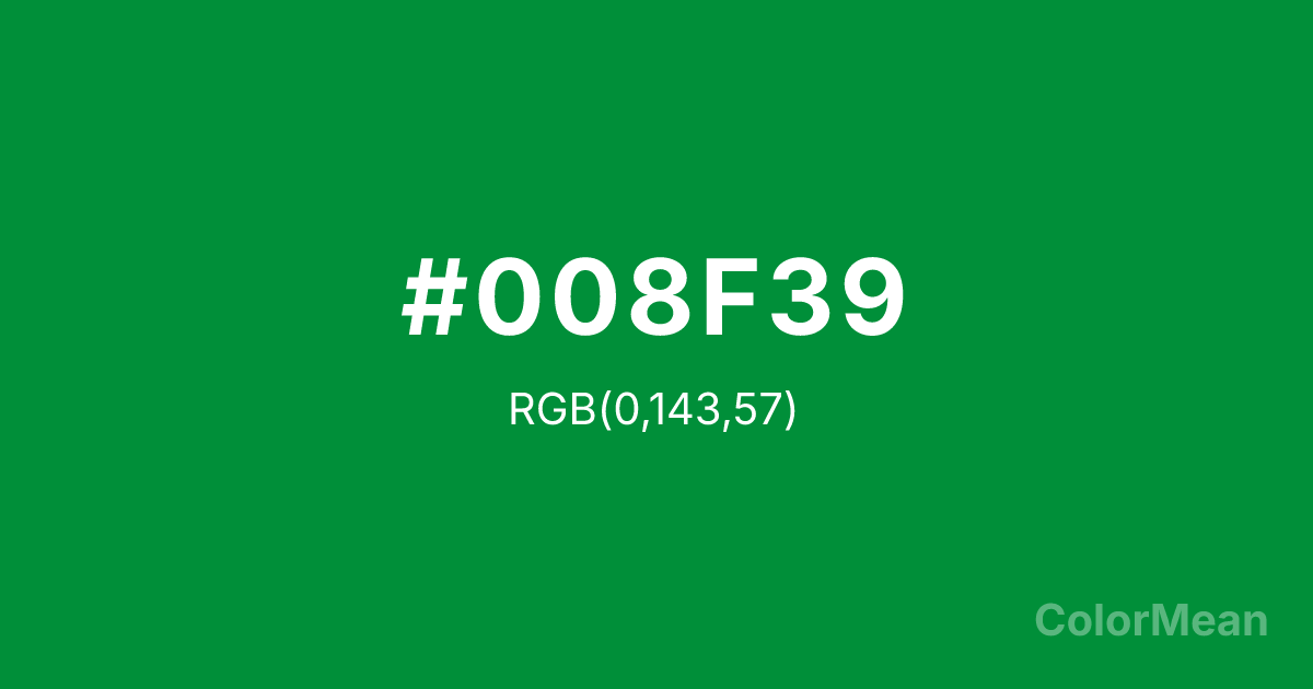 Pure Green (#008F39) RGB value is (0, 143, 57). The hex color red value is 0, green is 143, and blue is 57. Its HSL format shows a hue of 144°, saturation of 100 percent, and lightness of 28 percent. The CMYK process values are 100 percent, 0 percent, 60 percent, 44 percent.