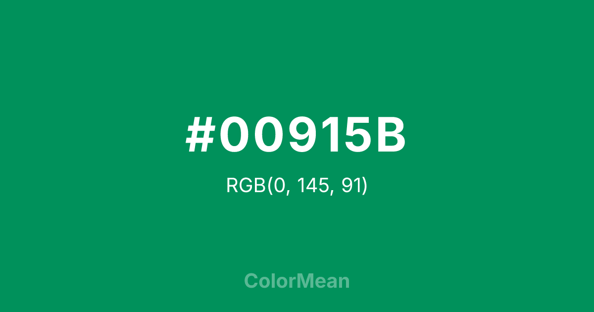 #00915B RGB value is (0, 145, 91). The hex color red value is 0, green is 145, and blue is 91. Its HSL format shows a hue of 158°, saturation of 100 percent, and lightness of 28 percent. The CMYK process values are 100 percent, 0 percent, 37 percent, 43 percent.