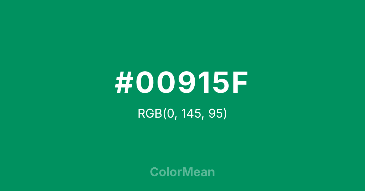 #00915F RGB value is (0, 145, 95). The hex color red value is 0, green is 145, and blue is 95. Its HSL format shows a hue of 159°, saturation of 100 percent, and lightness of 28 percent. The CMYK process values are 100 percent, 0 percent, 34 percent, 43 percent.