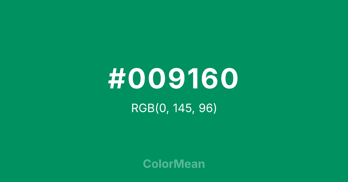 #009160 RGB value is (0, 145, 96). The hex color red value is 0, green is 145, and blue is 96. Its HSL format shows a hue of 160°, saturation of 100 percent, and lightness of 28 percent. The CMYK process values are 100 percent, 0 percent, 34 percent, 43 percent.