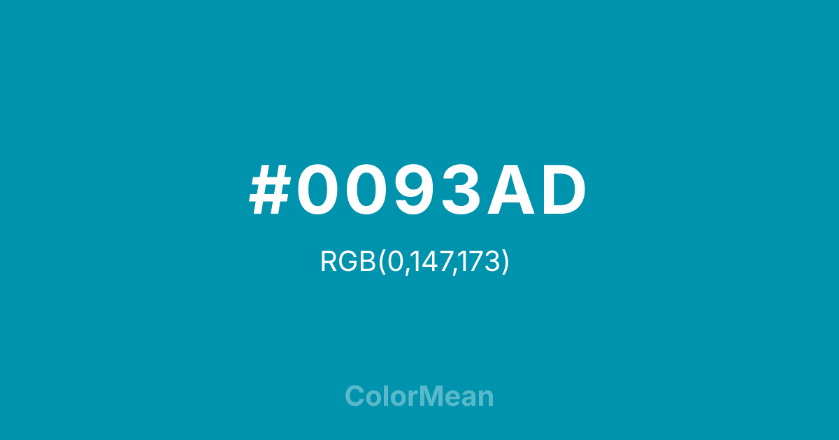 #0093AD RGB value is (0, 147, 173). The hex color red value is 0, green is 147, and blue is 173. Its HSL format shows a hue of 189°, saturation of 100 percent, and lightness of 34 percent. The CMYK process values are 100 percent, 15 percent, 0 percent, 32 percent.