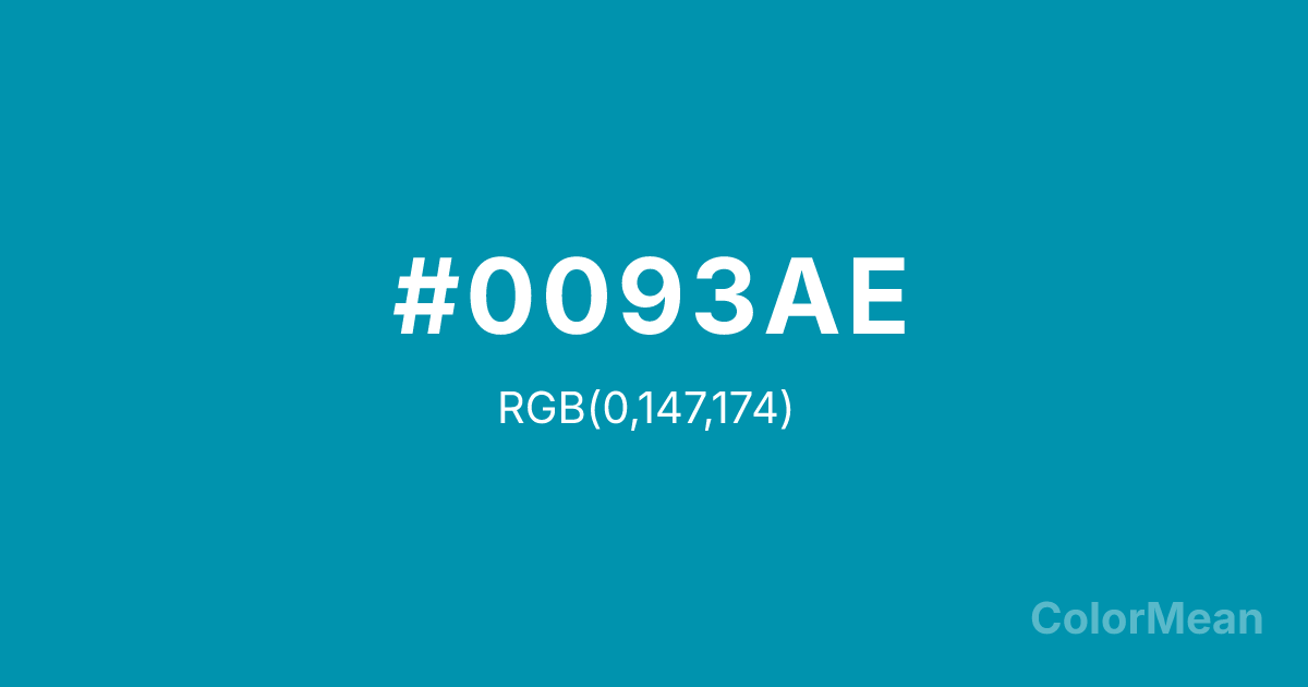 #0093AE RGB value is (0, 147, 174). The hex color red value is 0, green is 147, and blue is 174. Its HSL format shows a hue of 189°, saturation of 100 percent, and lightness of 34 percent. The CMYK process values are 100 percent, 16 percent, 0 percent, 32 percent.