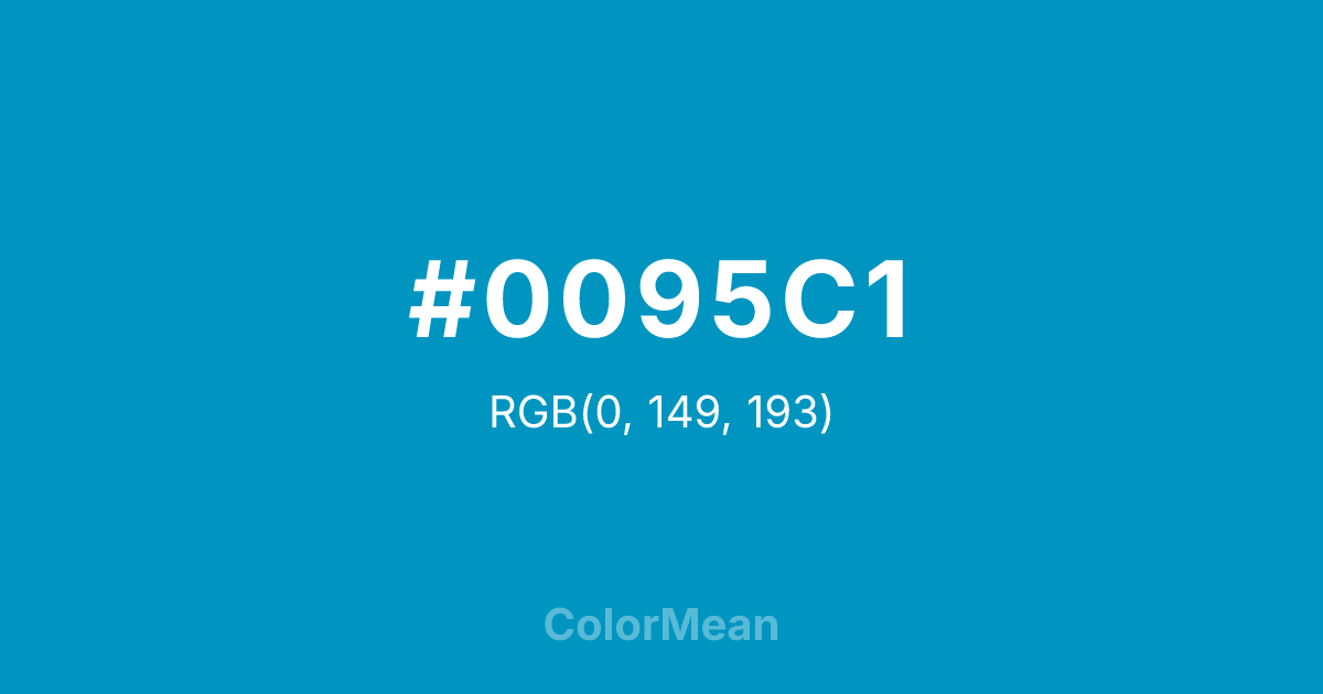 #0095C1 RGB value is (0, 149, 193). The hex color red value is 0, green is 149, and blue is 193. Its HSL format shows a hue of 194°, saturation of 100 percent, and lightness of 38 percent. The CMYK process values are 100 percent, 23 percent, 0 percent, 24 percent.