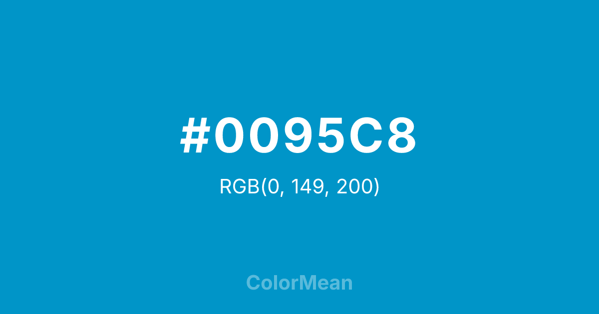 #0095C8 RGB value is (0, 149, 200). The hex color red value is 0, green is 149, and blue is 200. Its HSL format shows a hue of 195°, saturation of 100 percent, and lightness of 39 percent. The CMYK process values are 100 percent, 25 percent, 0 percent, 22 percent.