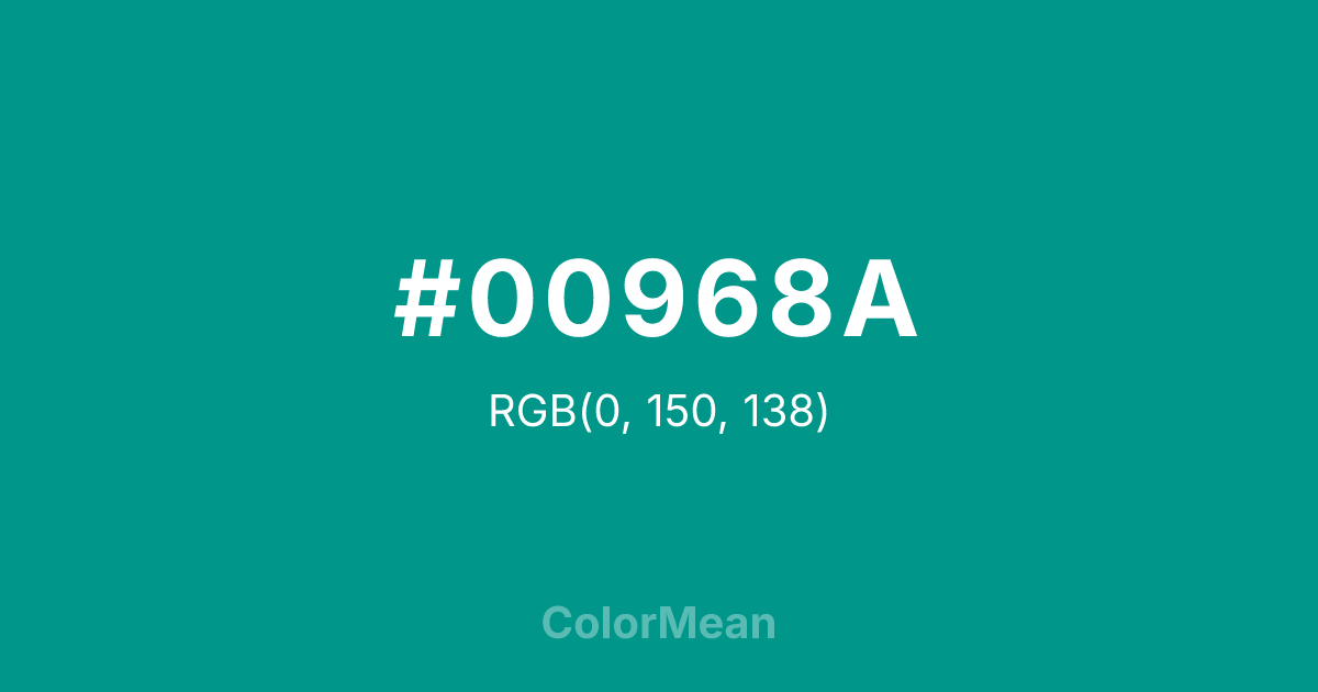 #00968A RGB value is (0, 150, 138). The hex color red value is 0, green is 150, and blue is 138. Its HSL format shows a hue of 175°, saturation of 100 percent, and lightness of 29 percent. The CMYK process values are 100 percent, 0 percent, 8 percent, 41 percent.