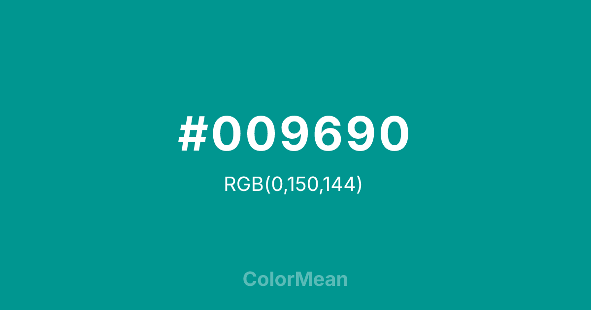 #009690 RGB value is (0, 150, 144). The hex color red value is 0, green is 150, and blue is 144. Its HSL format shows a hue of 178°, saturation of 100 percent, and lightness of 29 percent. The CMYK process values are 100 percent, 0 percent, 4 percent, 41 percent.