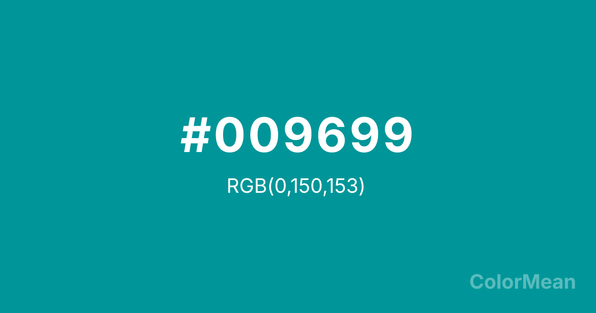 #009699 RGB value is (0, 150, 153). The hex color red value is 0, green is 150, and blue is 153. Its HSL format shows a hue of 181°, saturation of 100 percent, and lightness of 30 percent. The CMYK process values are 100 percent, 2 percent, 0 percent, 40 percent.