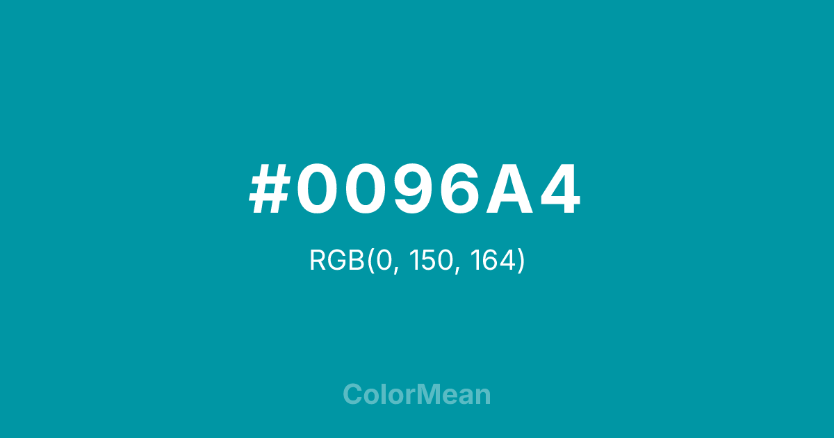 #0096A4 RGB value is (0, 150, 164). The hex color red value is 0, green is 150, and blue is 164. Its HSL format shows a hue of 185°, saturation of 100 percent, and lightness of 32 percent. The CMYK process values are 100 percent, 9 percent, 0 percent, 36 percent.