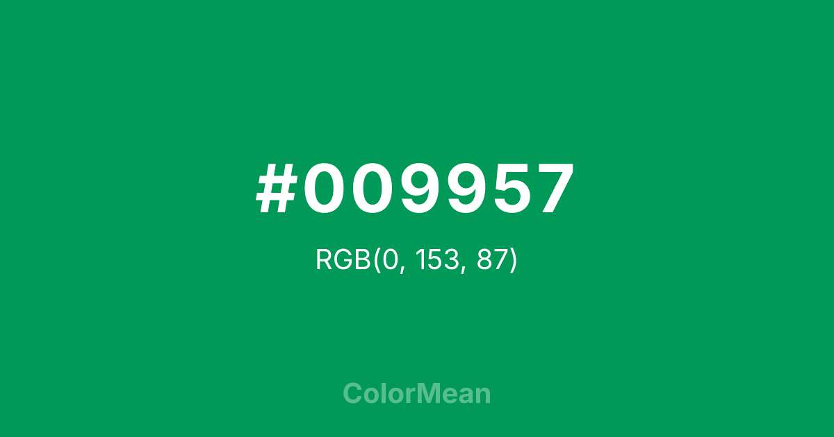 #009957 RGB value is (0, 153, 87). The hex color red value is 0, green is 153, and blue is 87. Its HSL format shows a hue of 154°, saturation of 100 percent, and lightness of 30 percent. The CMYK process values are 100 percent, 0 percent, 43 percent, 40 percent.