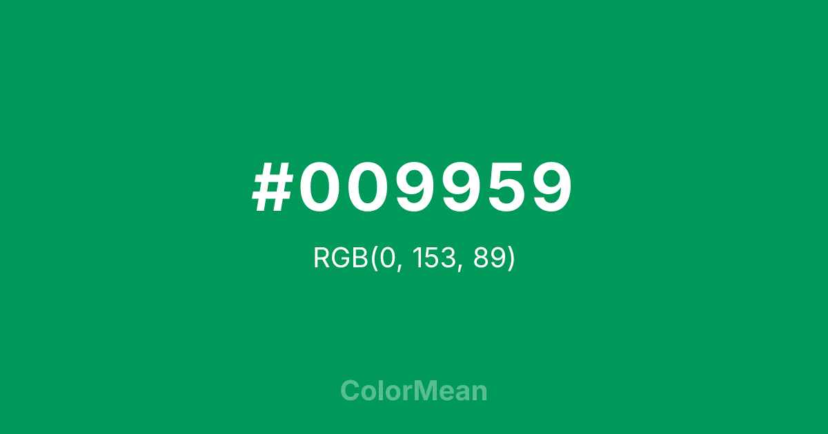 #009959 RGB value is (0, 153, 89). The hex color red value is 0, green is 153, and blue is 89. Its HSL format shows a hue of 155°, saturation of 100 percent, and lightness of 30 percent. The CMYK process values are 100 percent, 0 percent, 42 percent, 40 percent.