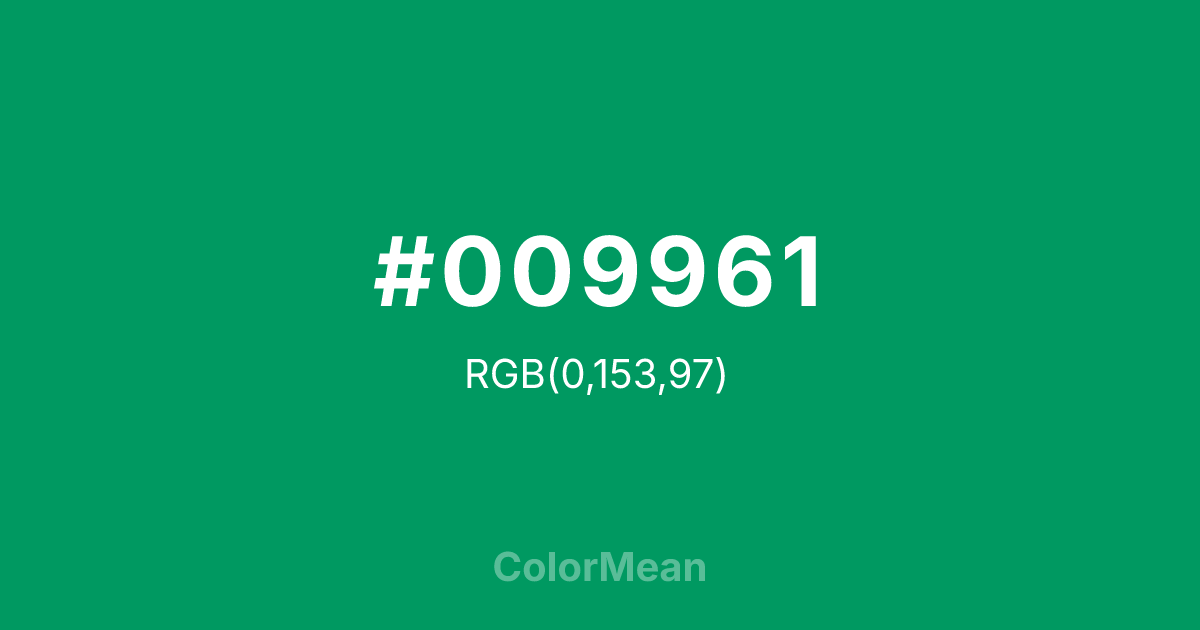 #009961 RGB value is (0, 153, 97). The hex color red value is 0, green is 153, and blue is 97. Its HSL format shows a hue of 158°, saturation of 100 percent, and lightness of 30 percent. The CMYK process values are 100 percent, 0 percent, 37 percent, 40 percent.