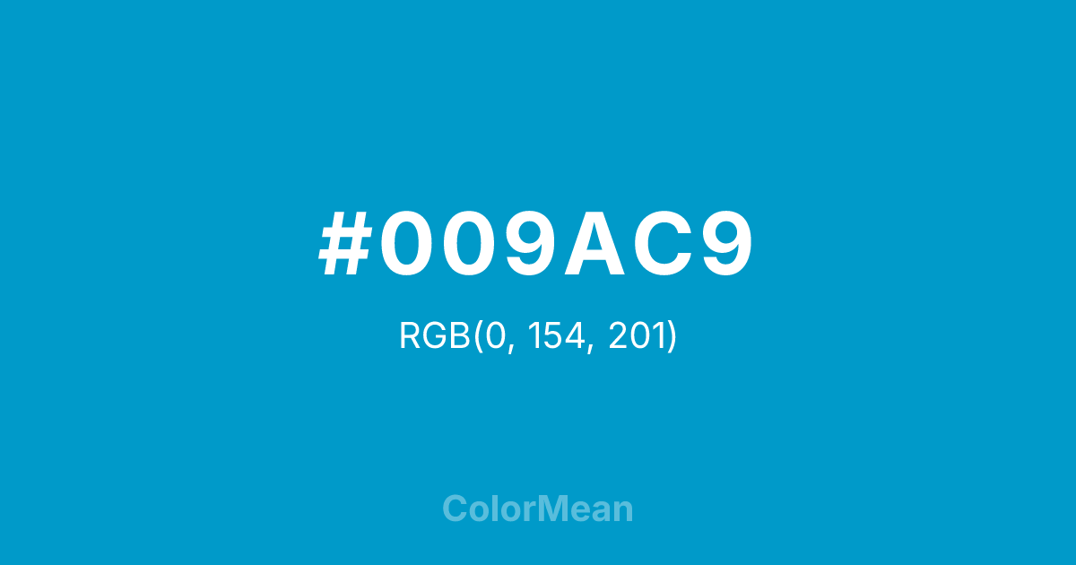 #009AC9 RGB value is (0, 154, 201). The hex color red value is 0, green is 154, and blue is 201. Its HSL format shows a hue of 194°, saturation of 100 percent, and lightness of 39 percent. The CMYK process values are 100 percent, 23 percent, 0 percent, 21 percent.