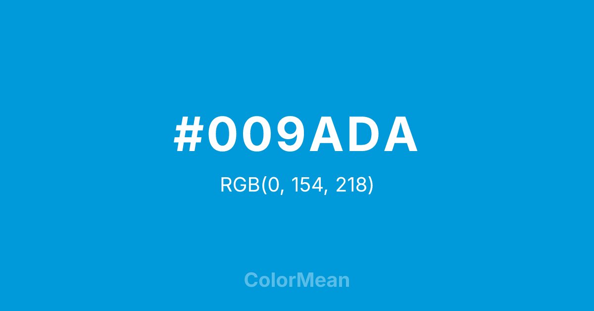 #009ADA RGB value is (0, 154, 218). The hex color red value is 0, green is 154, and blue is 218. Its HSL format shows a hue of 198°, saturation of 100 percent, and lightness of 43 percent. The CMYK process values are 100 percent, 29 percent, 0 percent, 15 percent.
