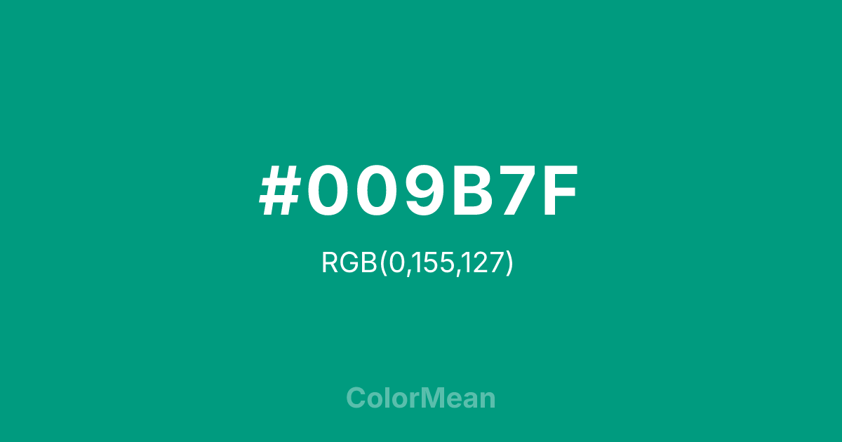 #009B7F RGB value is (0, 155, 127). The hex color red value is 0, green is 155, and blue is 127. Its HSL format shows a hue of 169°, saturation of 100 percent, and lightness of 30 percent. The CMYK process values are 100 percent, 0 percent, 18 percent, 39 percent.