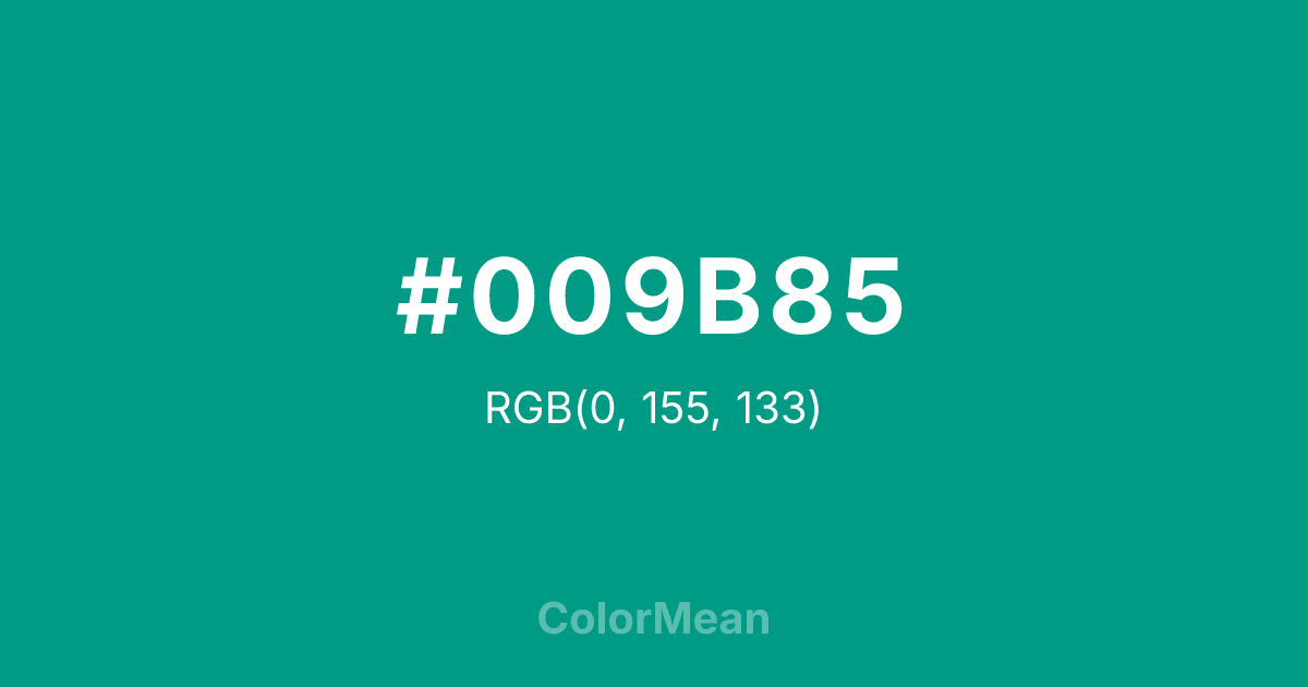 #009B85 RGB value is (0, 155, 133). The hex color red value is 0, green is 155, and blue is 133. Its HSL format shows a hue of 171°, saturation of 100 percent, and lightness of 30 percent. The CMYK process values are 100 percent, 0 percent, 14 percent, 39 percent.