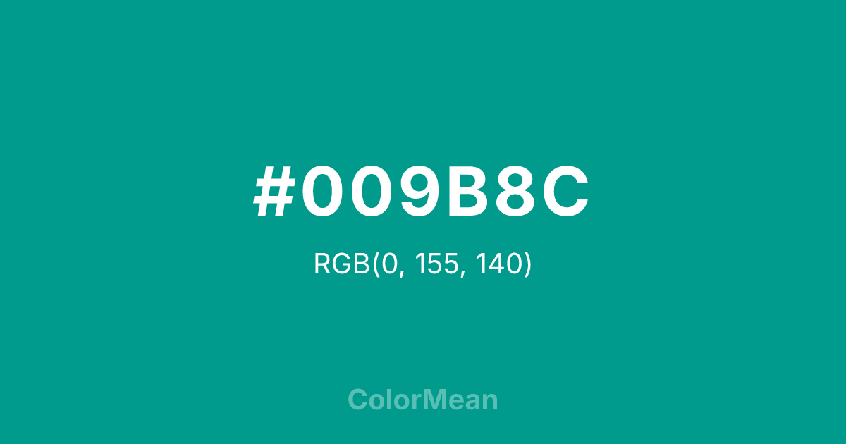 #009B8C RGB value is (0, 155, 140). The hex color red value is 0, green is 155, and blue is 140. Its HSL format shows a hue of 174°, saturation of 100 percent, and lightness of 30 percent. The CMYK process values are 100 percent, 0 percent, 10 percent, 39 percent.