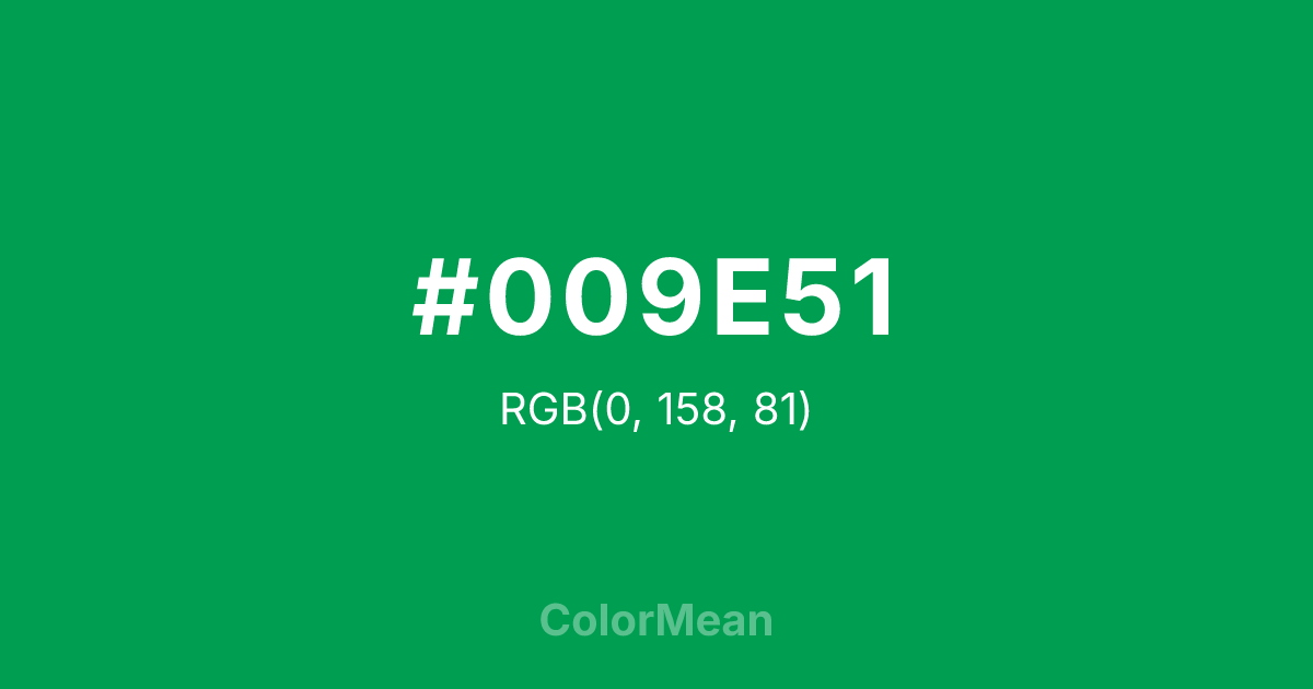 #009E51 RGB value is (0, 158, 81). The hex color red value is 0, green is 158, and blue is 81. Its HSL format shows a hue of 151°, saturation of 100 percent, and lightness of 31 percent. The CMYK process values are 100 percent, 0 percent, 49 percent, 38 percent.