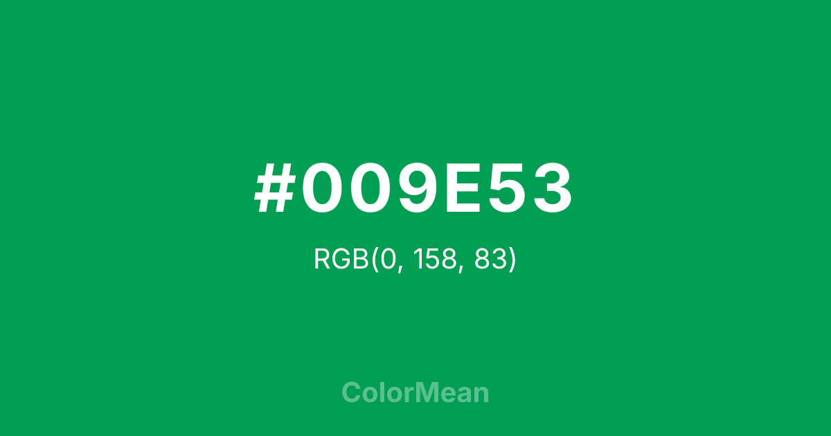 #009E53 RGB value is (0, 158, 83). The hex color red value is 0, green is 158, and blue is 83. Its HSL format shows a hue of 152°, saturation of 100 percent, and lightness of 31 percent. The CMYK process values are 100 percent, 0 percent, 47 percent, 38 percent.