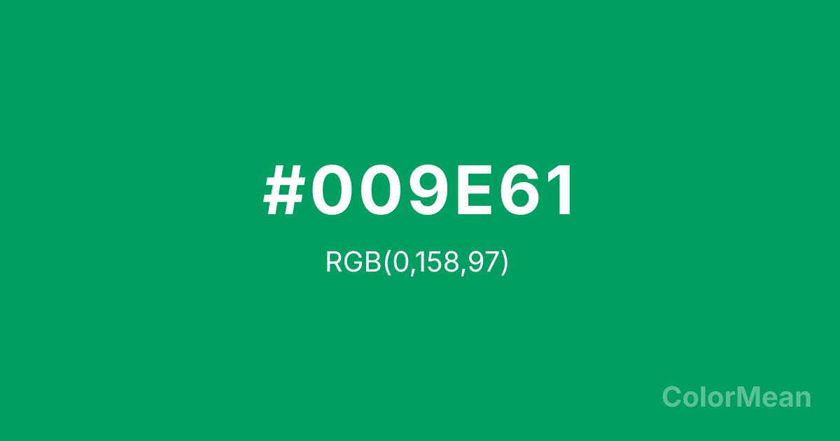 #009E61 RGB value is (0, 158, 97). The hex color red value is 0, green is 158, and blue is 97. Its HSL format shows a hue of 157°, saturation of 100 percent, and lightness of 31 percent. The CMYK process values are 100 percent, 0 percent, 39 percent, 38 percent.