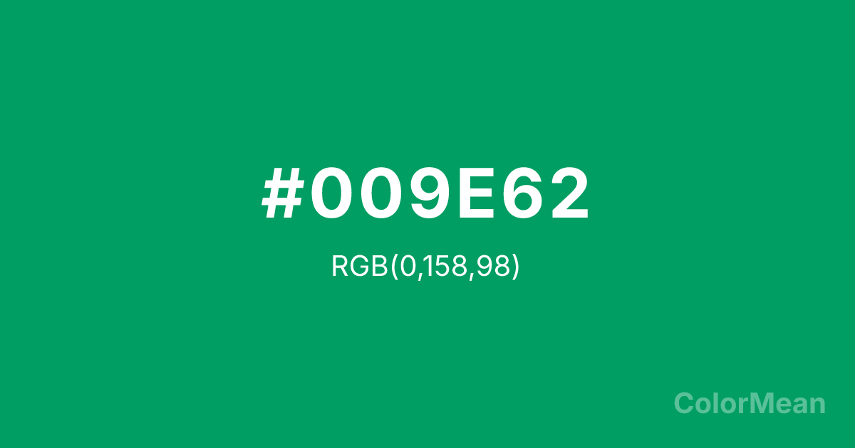 #009E62 RGB value is (0, 158, 98). The hex color red value is 0, green is 158, and blue is 98. Its HSL format shows a hue of 157°, saturation of 100 percent, and lightness of 31 percent. The CMYK process values are 100 percent, 0 percent, 38 percent, 38 percent.