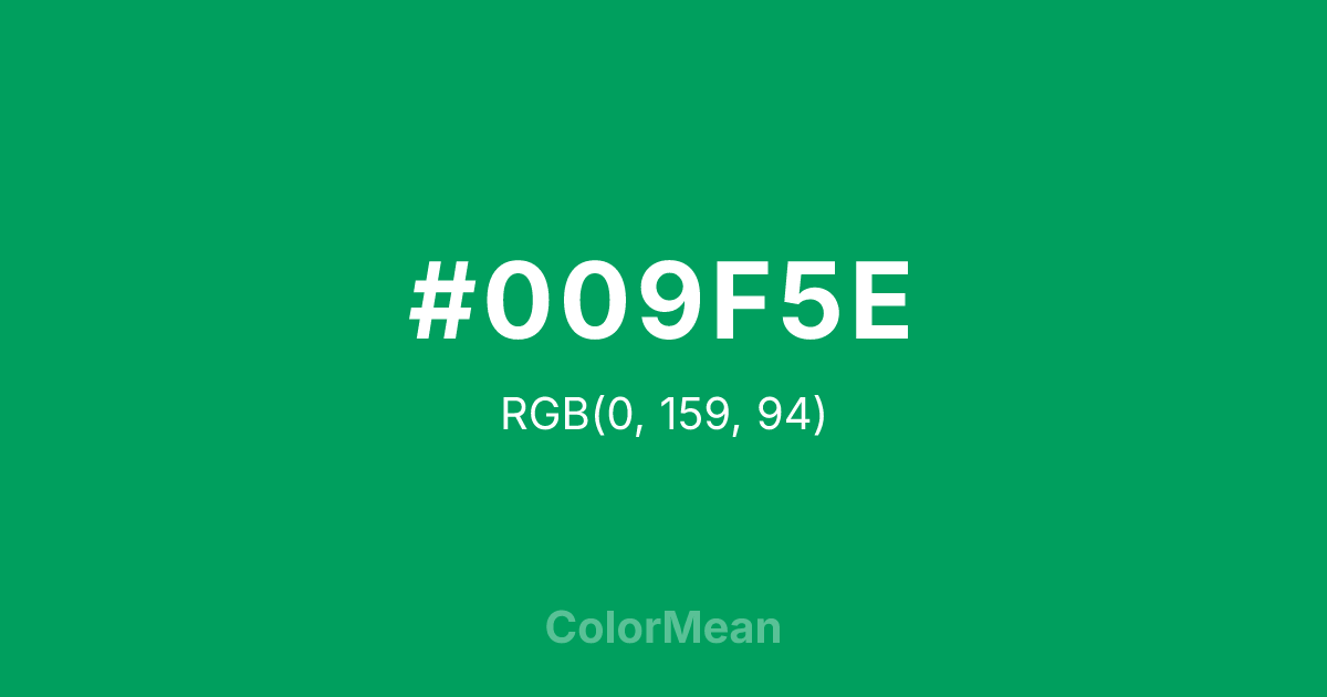 #009F5E RGB value is (0, 159, 94). The hex color red value is 0, green is 159, and blue is 94. Its HSL format shows a hue of 155°, saturation of 100 percent, and lightness of 31 percent. The CMYK process values are 100 percent, 0 percent, 41 percent, 38 percent.