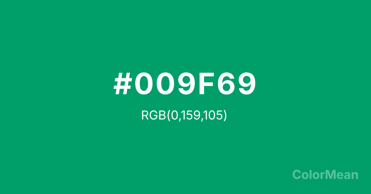 #009F69 RGB value is (0, 159, 105). The hex color red value is 0, green is 159, and blue is 105. Its HSL format shows a hue of 160°, saturation of 100 percent, and lightness of 31 percent. The CMYK process values are 100 percent, 0 percent, 34 percent, 38 percent.