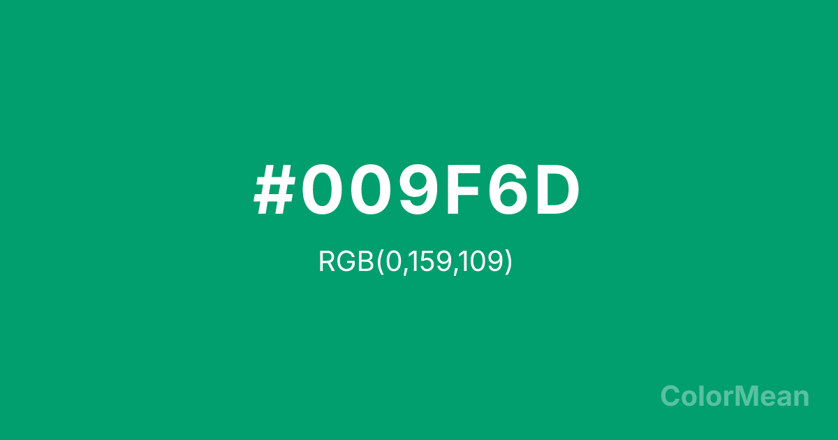 #009F6D RGB value is (0, 159, 109). The hex color red value is 0, green is 159, and blue is 109. Its HSL format shows a hue of 161°, saturation of 100 percent, and lightness of 31 percent. The CMYK process values are 100 percent, 0 percent, 31 percent, 38 percent.