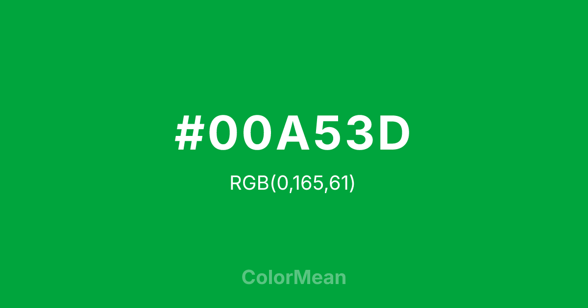 #00A53D RGB value is (0, 165, 61). The hex color red value is 0, green is 165, and blue is 61. Its HSL format shows a hue of 142°, saturation of 100 percent, and lightness of 32 percent. The CMYK process values are 100 percent, 0 percent, 63 percent, 35 percent.