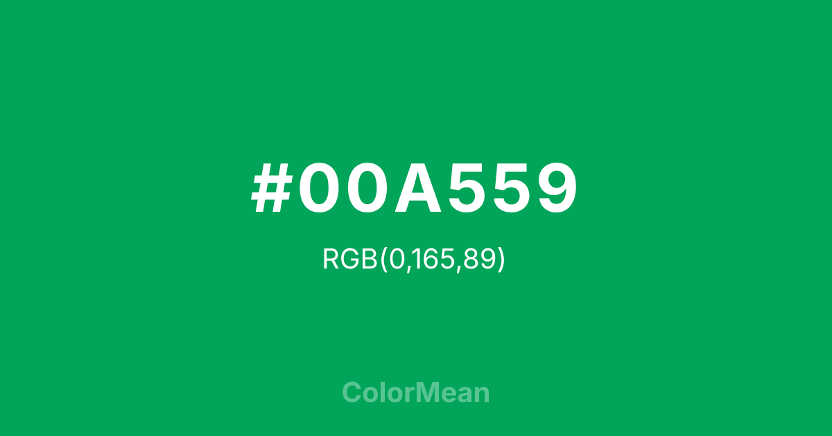 #00A559 RGB value is (0, 165, 89). The hex color red value is 0, green is 165, and blue is 89. Its HSL format shows a hue of 152°, saturation of 100 percent, and lightness of 32 percent. The CMYK process values are 100 percent, 0 percent, 46 percent, 35 percent.