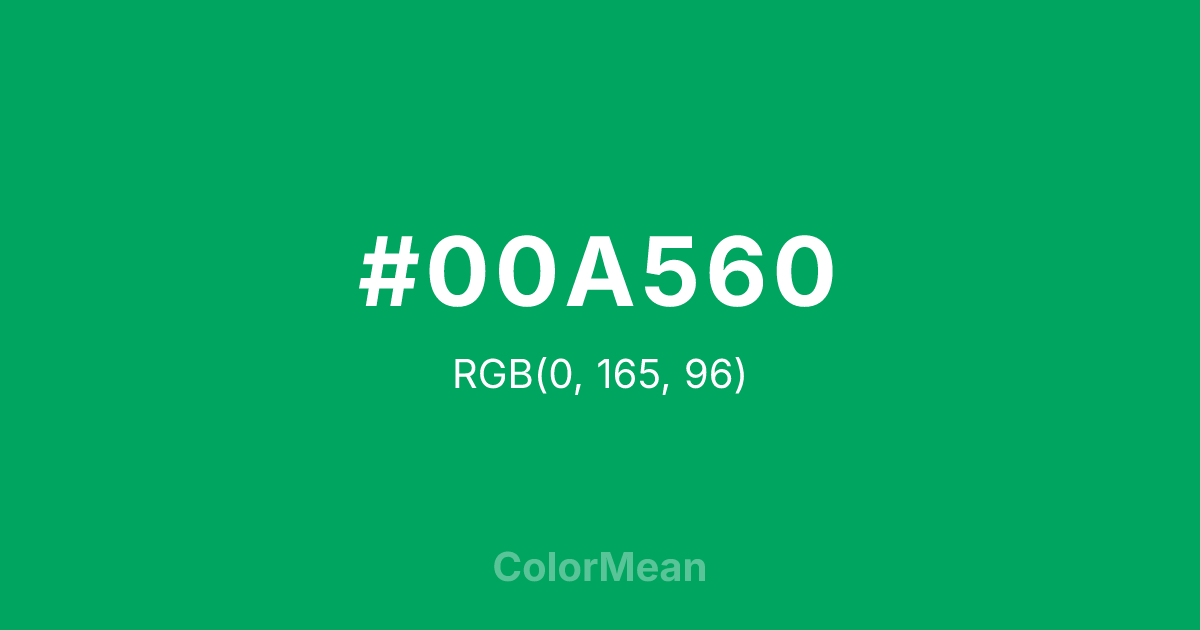 #00A560 RGB value is (0, 165, 96). The hex color red value is 0, green is 165, and blue is 96. Its HSL format shows a hue of 155°, saturation of 100 percent, and lightness of 32 percent. The CMYK process values are 100 percent, 0 percent, 42 percent, 35 percent.