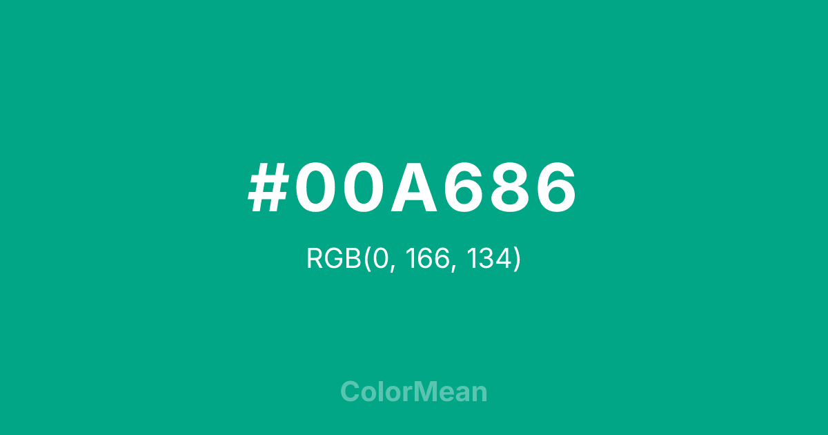 #00A686 RGB value is (0, 166, 134). The hex color red value is 0, green is 166, and blue is 134. Its HSL format shows a hue of 168°, saturation of 100 percent, and lightness of 33 percent. The CMYK process values are 100 percent, 0 percent, 19 percent, 35 percent.
