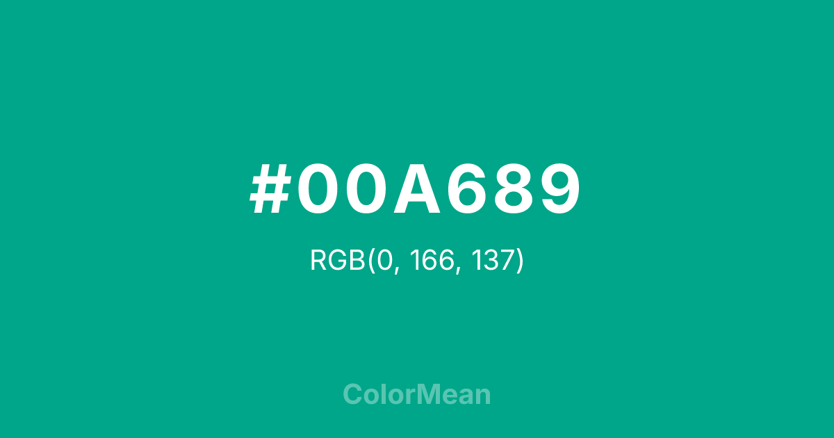 #00A689 RGB value is (0, 166, 137). The hex color red value is 0, green is 166, and blue is 137. Its HSL format shows a hue of 170°, saturation of 100 percent, and lightness of 33 percent. The CMYK process values are 100 percent, 0 percent, 17 percent, 35 percent.