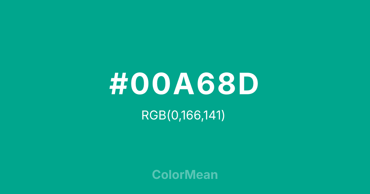 #00A68D RGB value is (0, 166, 141). The hex color red value is 0, green is 166, and blue is 141. Its HSL format shows a hue of 171°, saturation of 100 percent, and lightness of 33 percent. The CMYK process values are 100 percent, 0 percent, 15 percent, 35 percent.