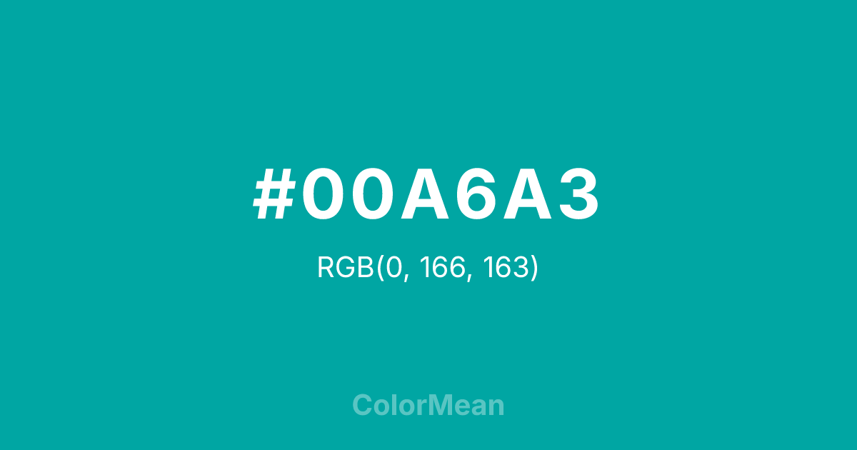 #00A6A3 RGB value is (0, 166, 163). The hex color red value is 0, green is 166, and blue is 163. Its HSL format shows a hue of 179°, saturation of 100 percent, and lightness of 33 percent. The CMYK process values are 100 percent, 0 percent, 2 percent, 35 percent.