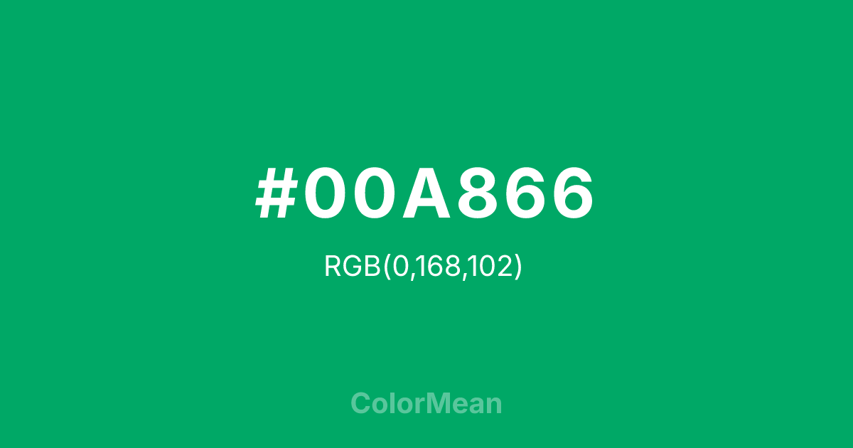 #00A866 RGB value is (0, 168, 102). The hex color red value is 0, green is 168, and blue is 102. Its HSL format shows a hue of 156°, saturation of 100 percent, and lightness of 33 percent. The CMYK process values are 100 percent, 0 percent, 39 percent, 34 percent.