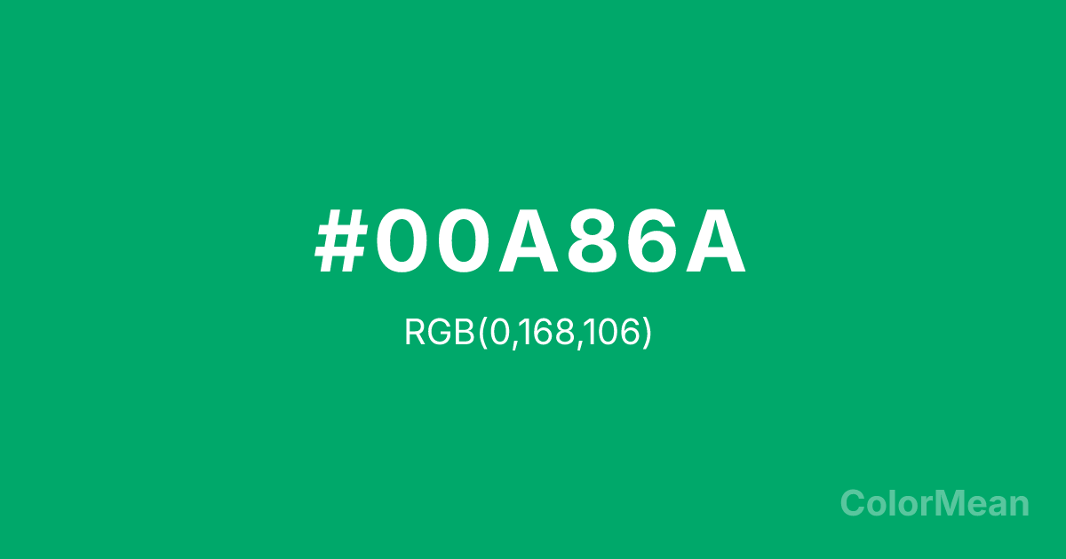 #00A86A RGB value is (0, 168, 106). The hex color red value is 0, green is 168, and blue is 106. Its HSL format shows a hue of 158°, saturation of 100 percent, and lightness of 33 percent. The CMYK process values are 100 percent, 0 percent, 37 percent, 34 percent.