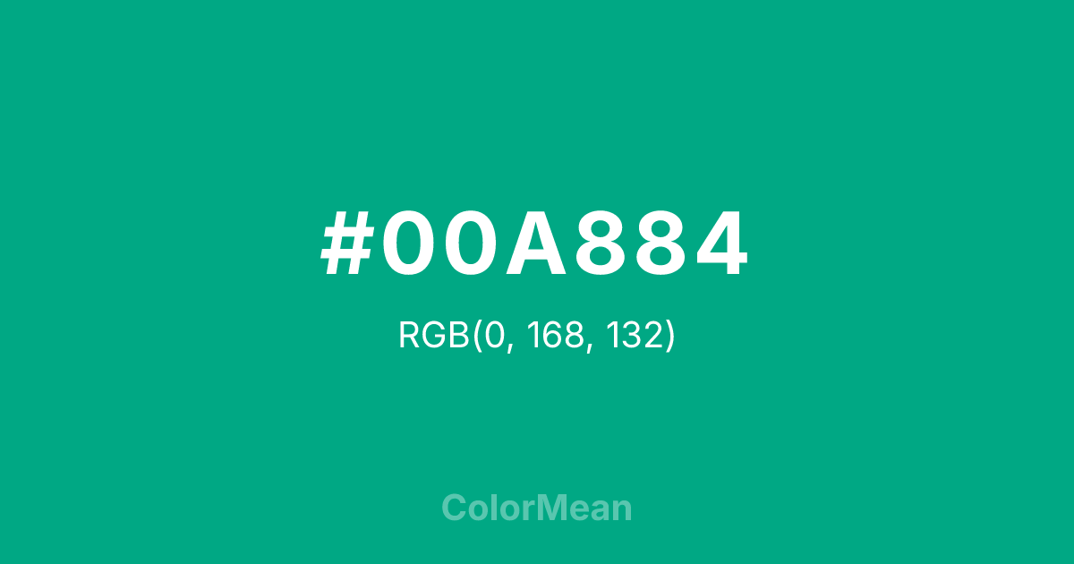 #00A884 RGB value is (0, 168, 132). The hex color red value is 0, green is 168, and blue is 132. Its HSL format shows a hue of 167°, saturation of 100 percent, and lightness of 33 percent. The CMYK process values are 100 percent, 0 percent, 21 percent, 34 percent.