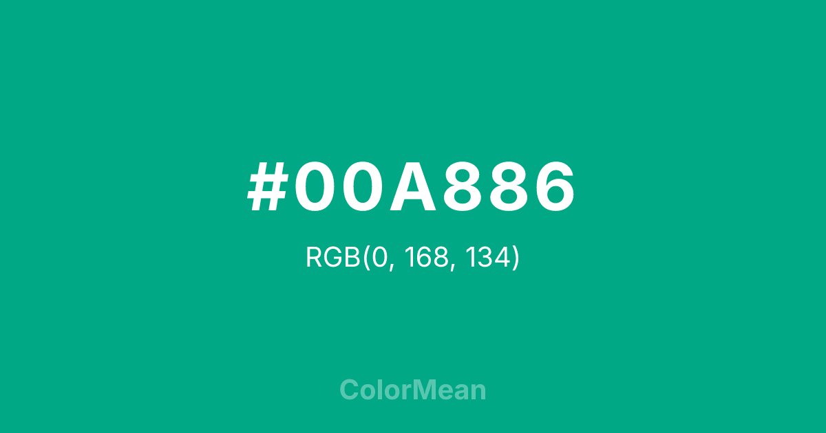 #00A886 RGB value is (0, 168, 134). The hex color red value is 0, green is 168, and blue is 134. Its HSL format shows a hue of 168°, saturation of 100 percent, and lightness of 33 percent. The CMYK process values are 100 percent, 0 percent, 20 percent, 34 percent.