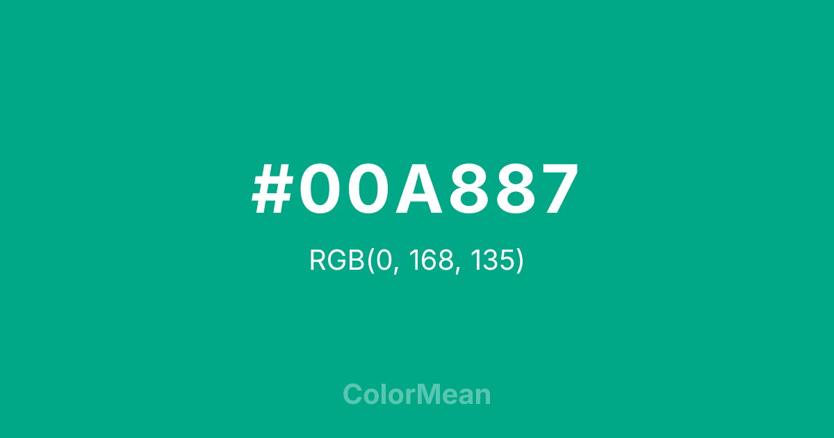 #00A887 RGB value is (0, 168, 135). The hex color red value is 0, green is 168, and blue is 135. Its HSL format shows a hue of 168°, saturation of 100 percent, and lightness of 33 percent. The CMYK process values are 100 percent, 0 percent, 20 percent, 34 percent.