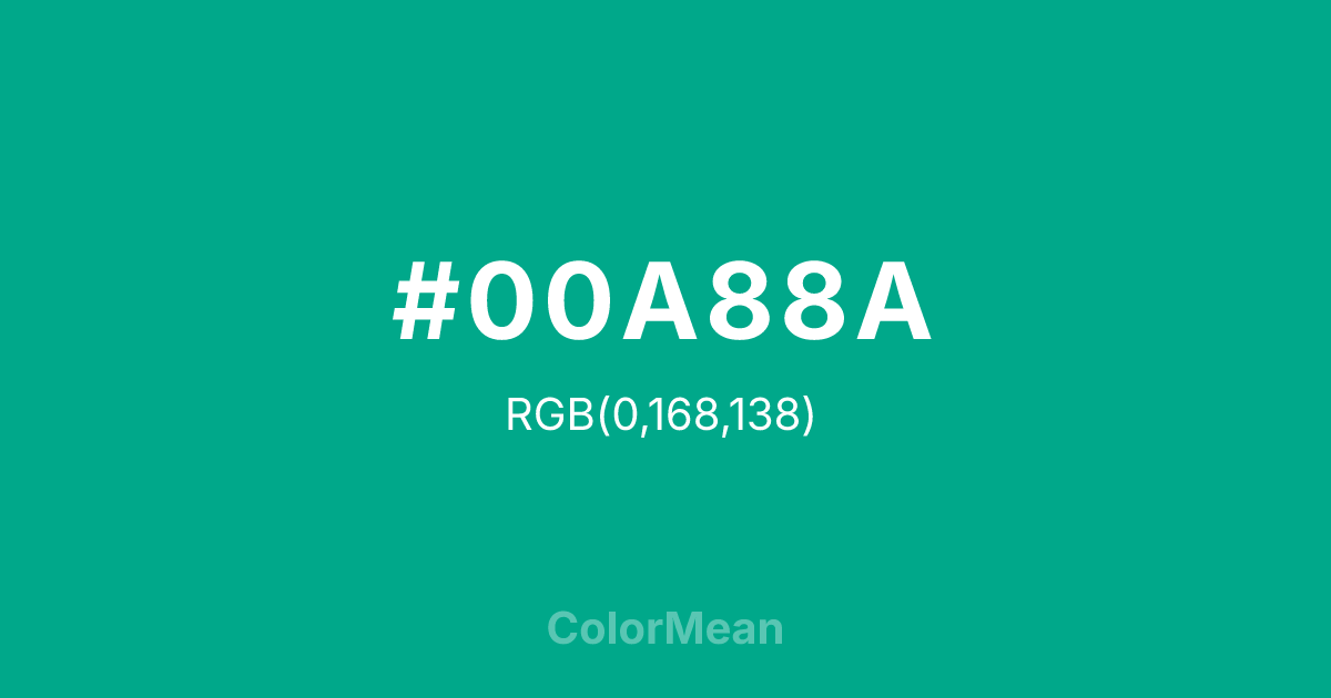 #00A88A RGB value is (0, 168, 138). The hex color red value is 0, green is 168, and blue is 138. Its HSL format shows a hue of 169°, saturation of 100 percent, and lightness of 33 percent. The CMYK process values are 100 percent, 0 percent, 18 percent, 34 percent.